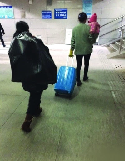 “她有三件行李,箱子、蛇皮袋和布袋,布袋帶子斷了,還抱著孩子,沒法走就急哭了,”樊阿姨忙過去拿出一個黑色垃圾袋,幫年輕婦女把蛇皮袋和布袋裝在一起,再幫忙抱起孩子,拖著行李箱,那名女子自己扛著黑塑料袋,從CD口通道出站,到金家墩長途客運站搭車。
